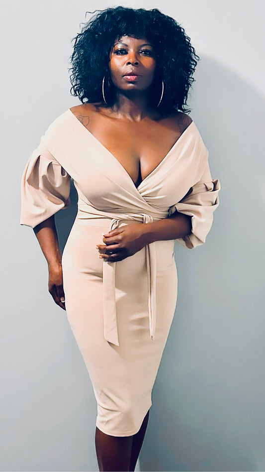 Nude Belted Bodycon Midi Dress – Flattering Off-the-Shoulder Look