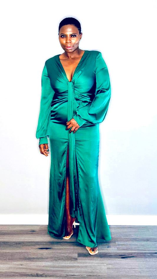 Front Twist Satin Dress – Long Sleeve Satin Maxi in Emerald Green