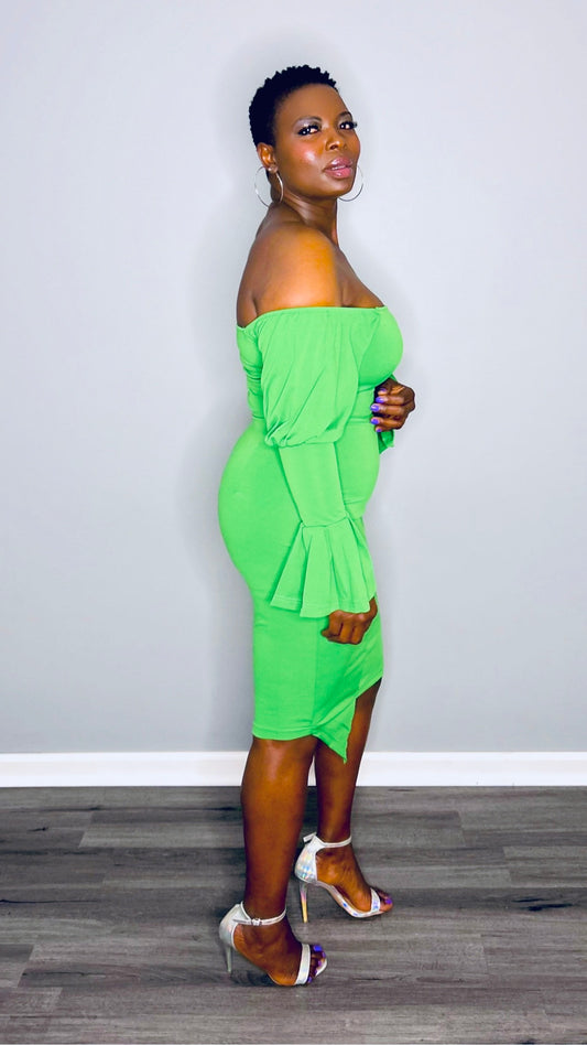 Solid Puff Sleeve Green Bodycon Dress – Sexy Off-the-Shoulder Style